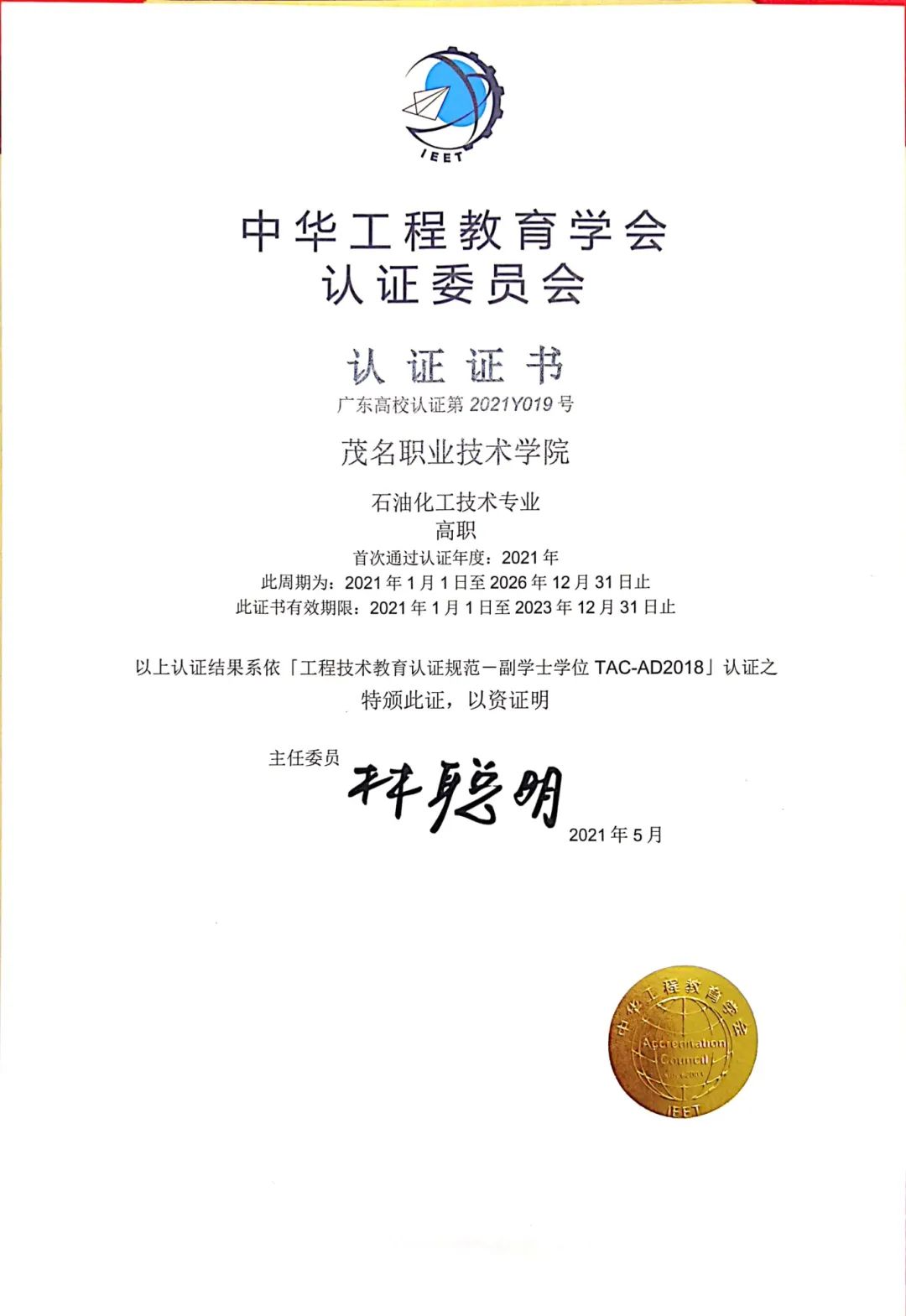 ▲石油化工技术专业通过IEET认证证书(中文版)