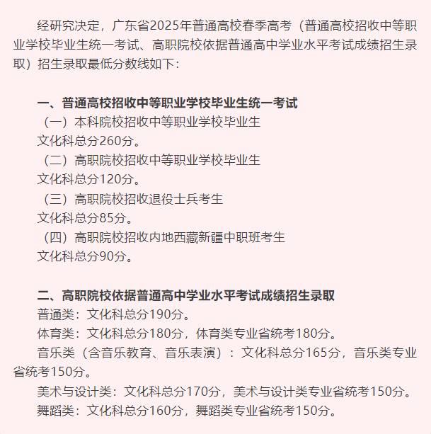 广东省2025年普通高校春季高考招生录取最低分数线