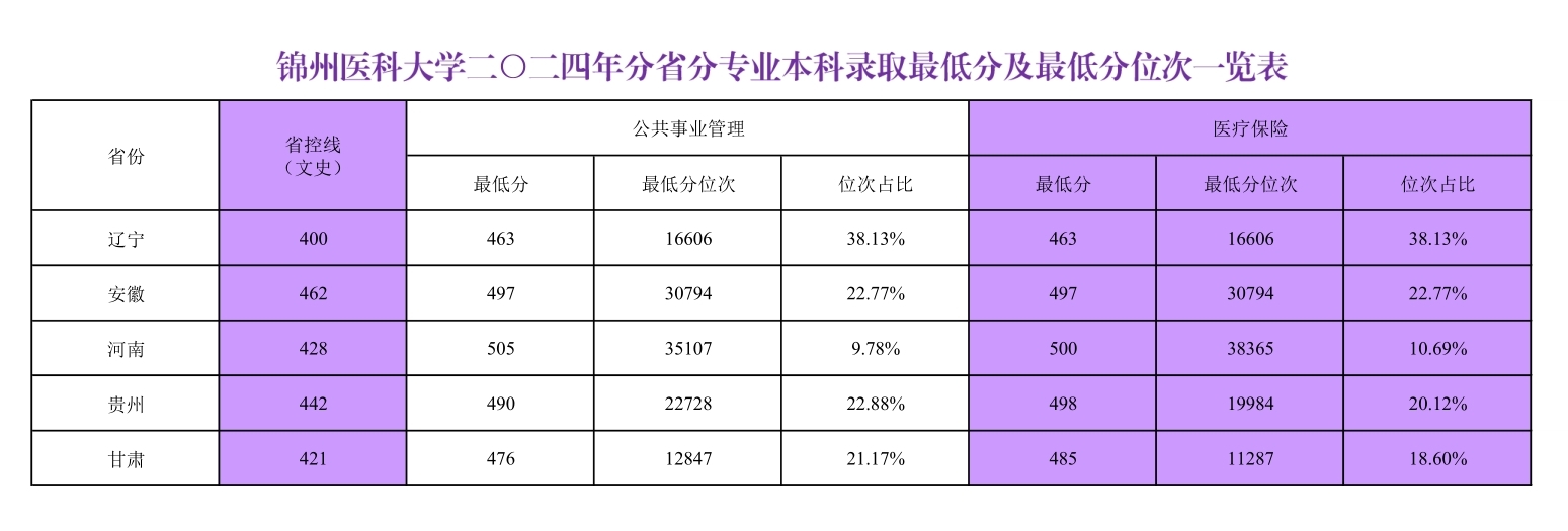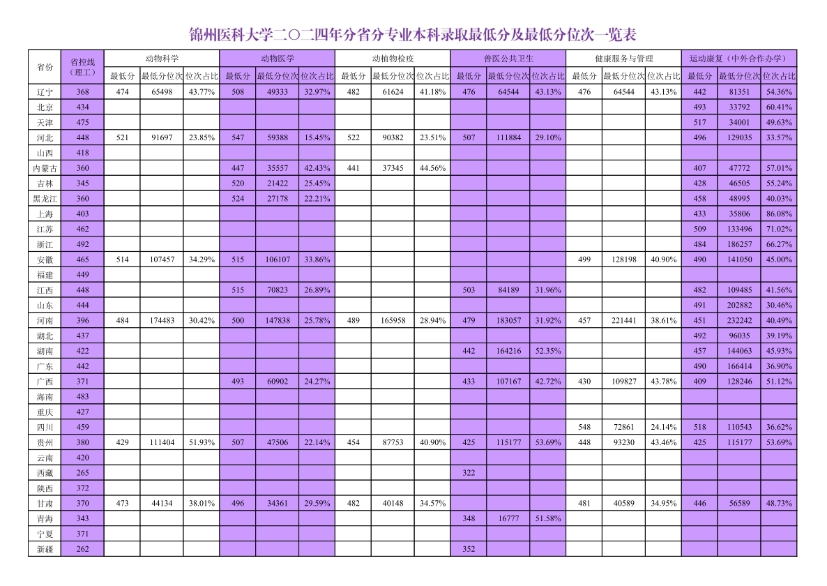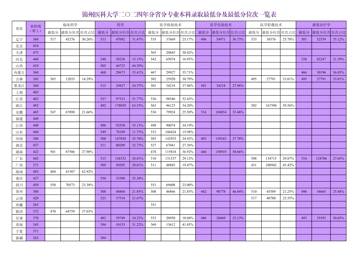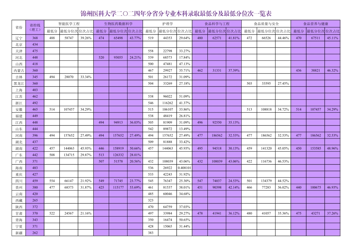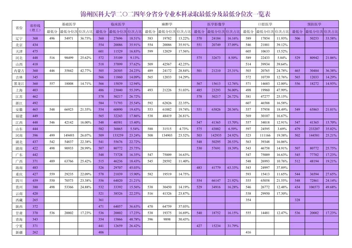 锦州医科大学二〇二四年分省分专业本科录取最低分及最低分位次一览表