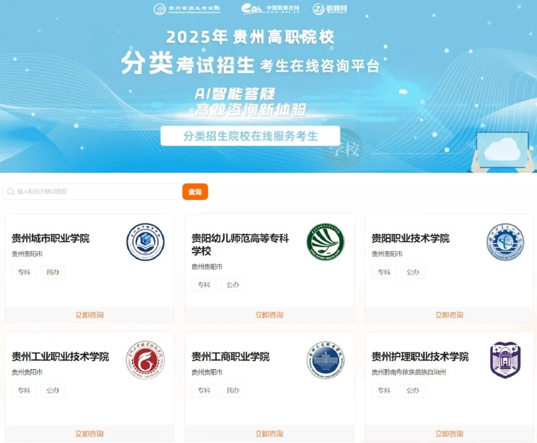 考生可点击“智能答疑系统”进入“2025年贵州高职院校分类考试招生考生在线咨询平台”,向相关学校咨询了解院校招生信息。