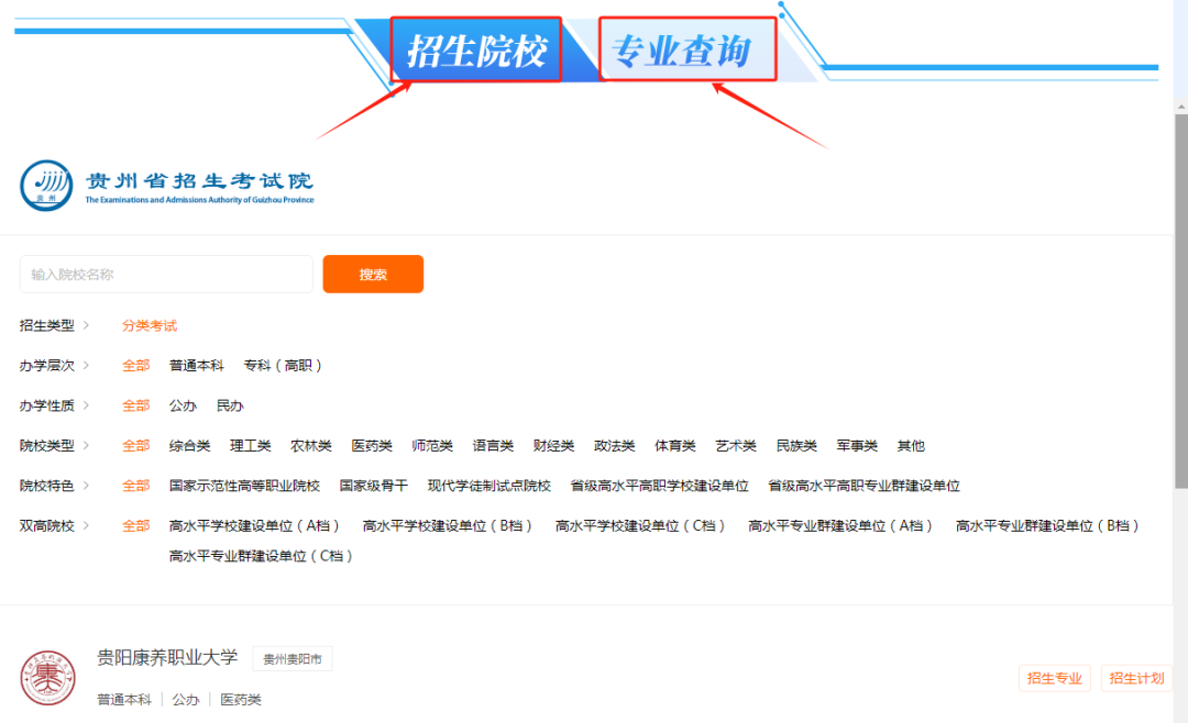 考生可通过“招生院校”或“专业查询”两种模式选择感兴趣的学校和专业,了解今年我省开展高职分类招生学校概况、专业介绍、招生简章、联系方式等信息。