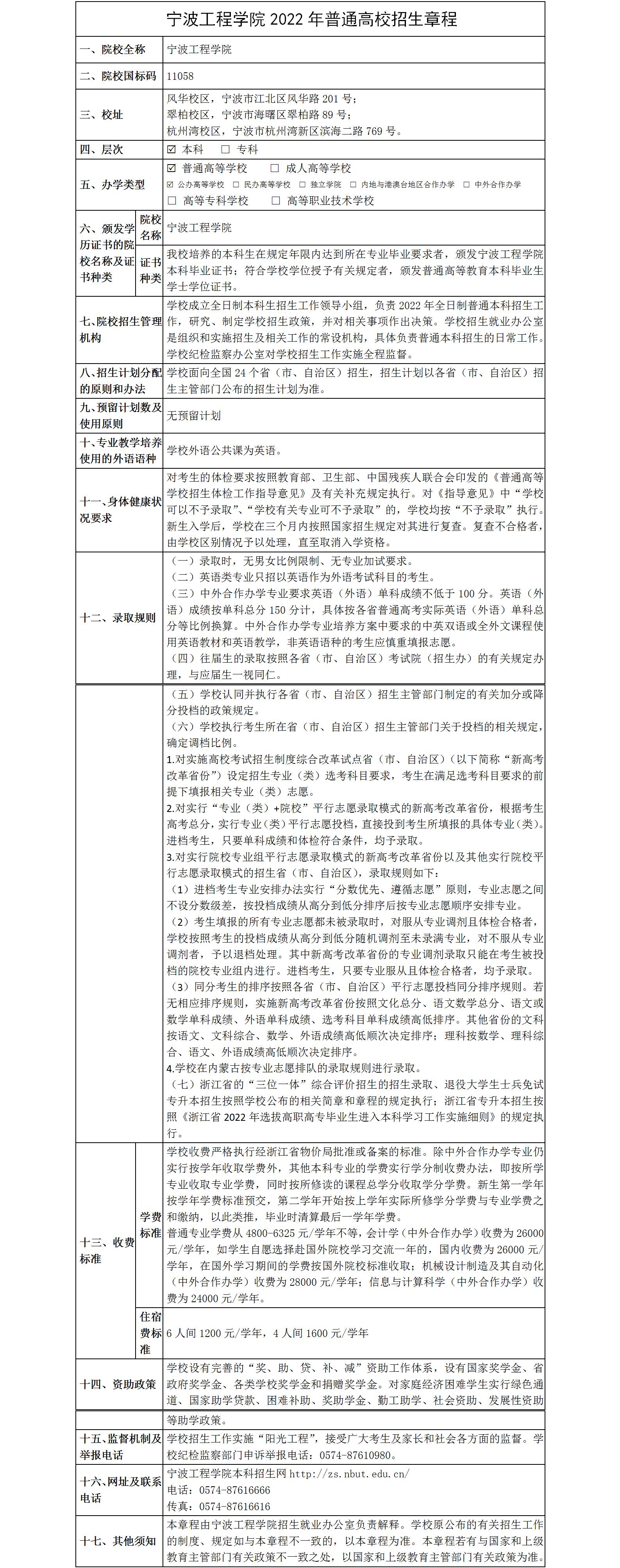 宁波工程学院2022年普通高校招生章程