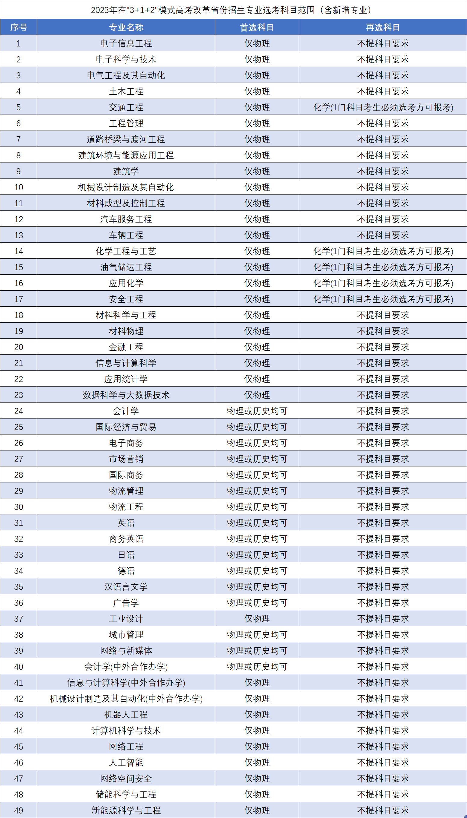 2023年在"3+1+2"模式高考改革省份招生专业选考科目范围(含新增专业)
