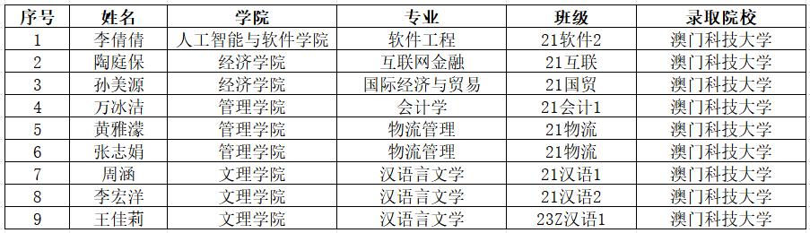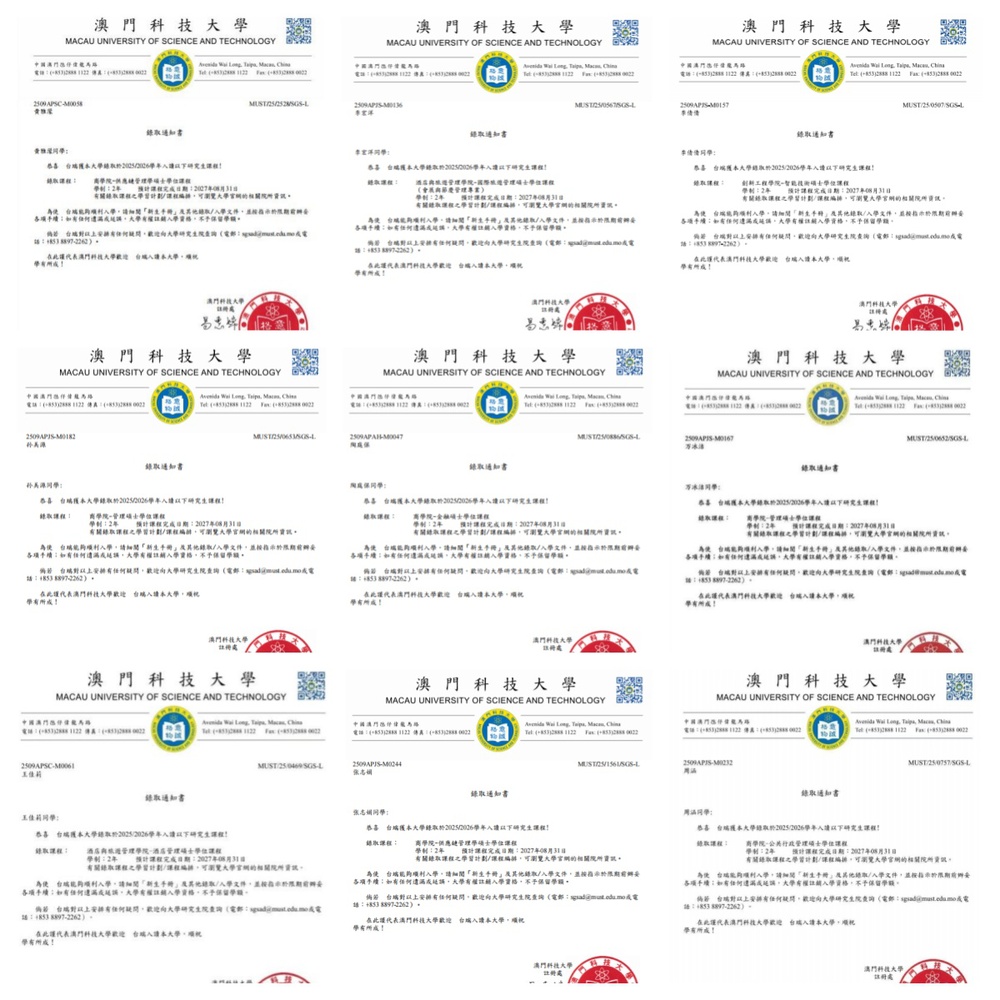 近日,经过澳门科技大学严格筛选与评审,我院2025届毕业生中有9名同学成功获得该校硕士研究生保荐入学资格,创历史新高。