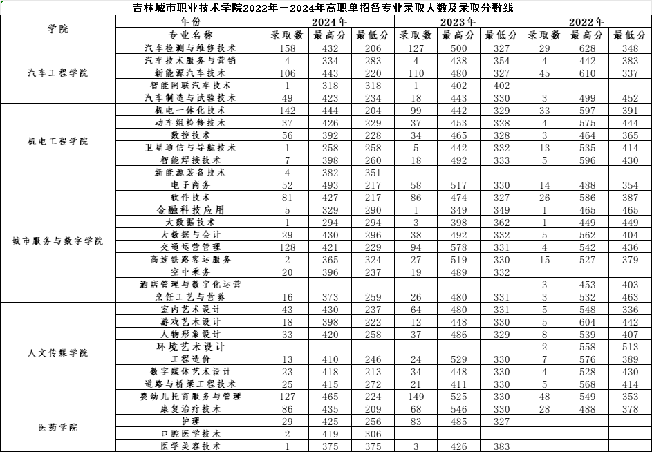 吉林城市职业技术学院2022年—2024年高职单招各专业录取人数及录取分数线