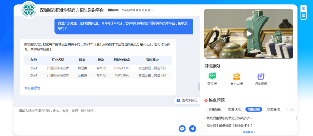 例如:当您向智能机器人小E问“我是广东考生,选科是物化生,今年考了480分,想学你们学校的计算机网络技术专业,能被录取吗?”,系统不仅能通过DeepSeek大模型技术精准识别您的咨询意图:省份、选科、分数、录取分数,还会结合历年录取数据,为您提供更有参考性的回复!