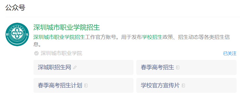 关注“深圳城市职业学院招生”微信公众号。点击下方二维码可扫码关注。