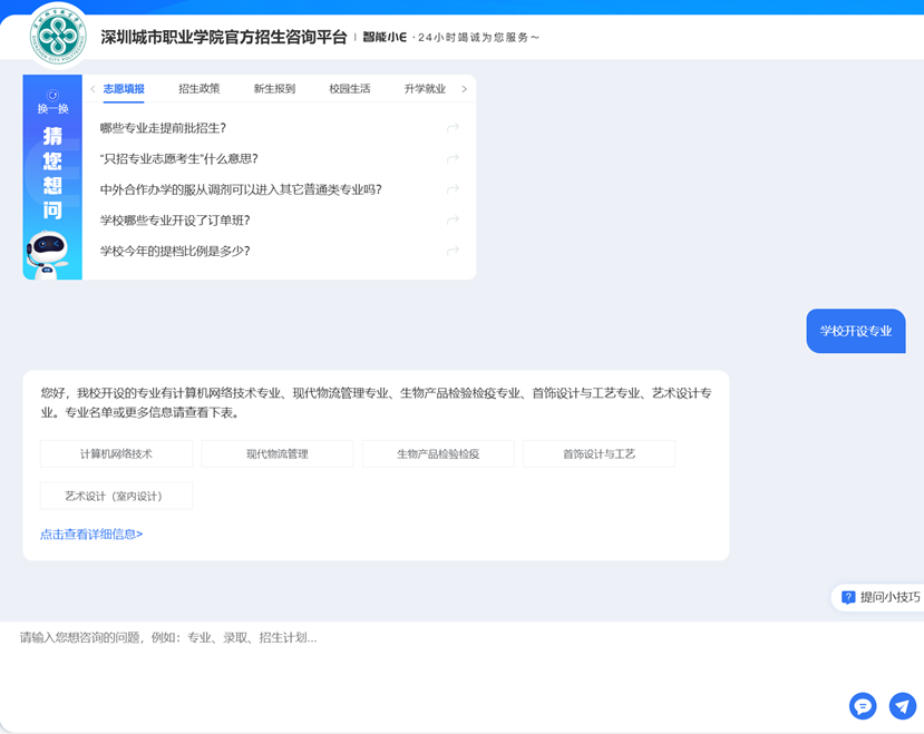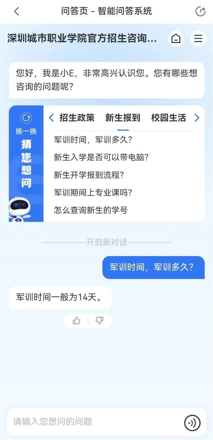 面对复杂的志愿填报、招生政策、入学报到或是关于校园生活的点滴疑问,您只需向“智能机器人小E”咨询,我们的招生智能问答系统依托DeepSeek大模型的强大语义理解能力,便可以迅速识别您的咨询意图,进行精准回答。