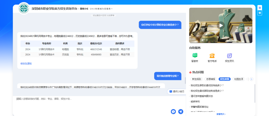 再如:当您提问:“你们学校今年计算机网络技术专业录取分数线是多少?”“现代物流管理专业呢”,系统能凭借DeepSeek大模型的逻辑分析能力,记住对话上下文信息,准确识别您的咨询意图,与第一轮对话中的“专业录取分数线”相关信息,为您提供更连贯、更精准的回答!