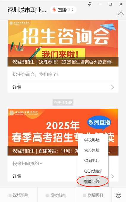 关注后进入公众号底部菜单栏,点击“联系我们”中的“智能问答”,即可24小时在线咨询。温馨提醒:公众号招生智能问答平台问答页同时支持语音提问。