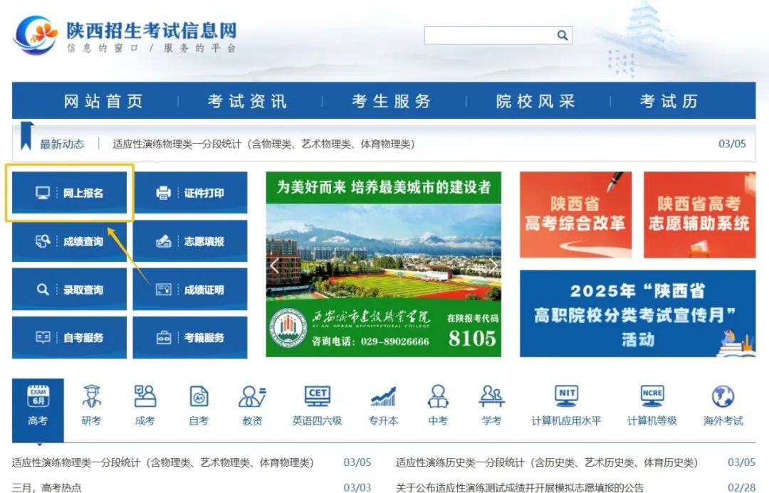 登录陕西省教育考试院门户网站(网址:https://www.sneea.cn)或陕西招生考试信息网(网址:https://www.sneac.com)点击“网上报名”,选择“2025年陕西省高职院校分类考试考生申请”一栏,点击“申请入口”,按步骤操作向我校提出入学申请即可。【陕西省教育考试院】申请步骤
