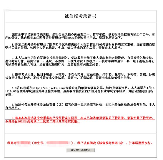 步骤3:认真阅读并签订诚信报考承诺书,确认本人信息后点击“确认并打印准考证”;