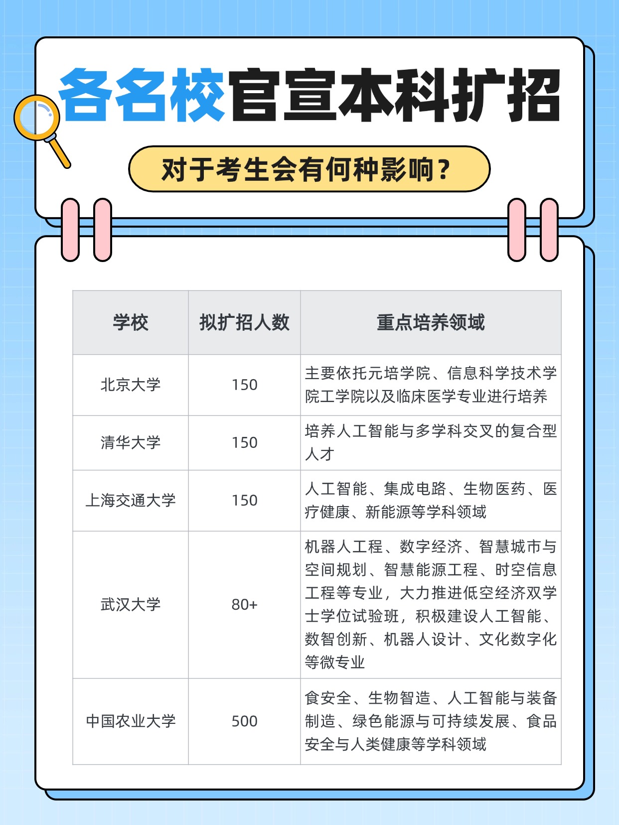 继清华宣布本科拟扩招150人之后,北京大学、中国人民大学等多所高校纷纷官宣本科扩招计划,扩招重点聚焦国家急需前沿技术及新兴业态。那么具体情况如何,一起了解!