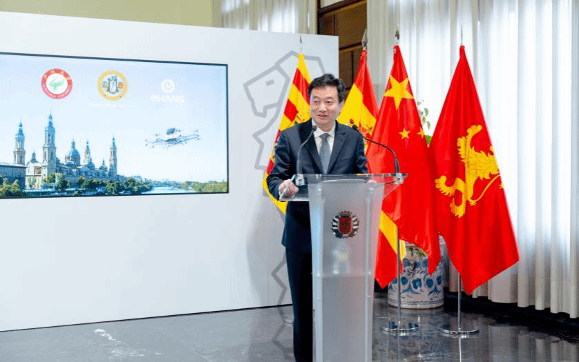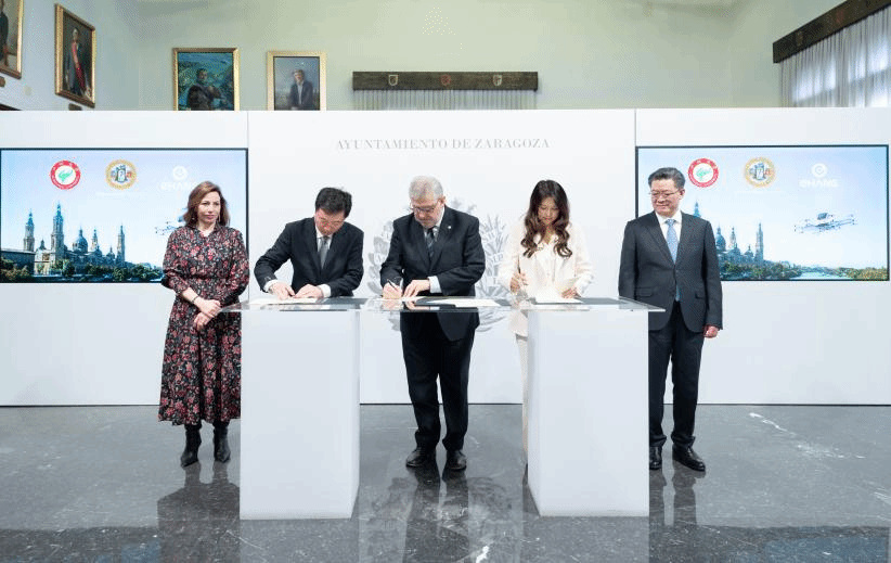 随后,我校代表团在萨拉戈萨市政府参加广州-萨拉戈萨市合作交流活动,在广州市代表团主要领导的见证下,与萨拉戈萨大学、亿航智能技术有限公司签署三方共建“低空飞行安全联合实验室”协议。广州市代表团主要领导及萨拉戈萨市市长娜塔莉亚·楚埃卡(Natalia Chueca)致辞发言,萨拉戈萨大学校长何塞·安东尼奥·马约拉尔(Jose Antonio Mayoral)、广州大学党委书记欧阳谦与亿航智能欧洲及拉丁美洲首席运营官向静共同签署了合作备忘录,亿航智能与广州市和萨拉戈萨市的合作迈入新篇章。我校负责人表示,将全力攻克“低空飞行安全保障”这一世界级难题,做好校校合作-校企合作的纽带,探索联合行业领军企业与国外高校共建新型教育科研机构的有效路径, 做好开展实施国际联合科研、推进落实高水平成果转化和创新人才国际合作培养模式等工作,加强与海内外高校交流互鉴,拓展合作空间,共同推动互利共赢。