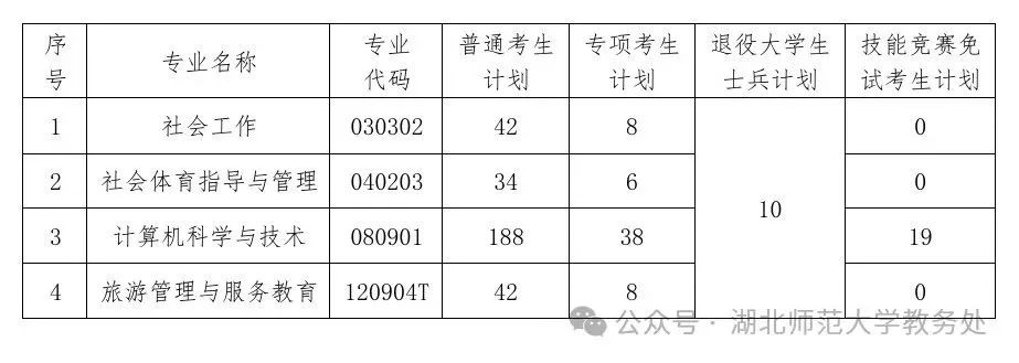 01招生对象1.应届高职(专科)毕业生2025年湖北省普通高校全日制高职(专科)应届毕业生,能如期取得专科毕业证书(简称“普通考生”)。2.专项计划考生“专升本专项计划”招收对象为符合普通考生报考条件,且经省农业农村厅(省乡村振兴局)确认的原建档立卡贫困家庭学生和防返贫动态监测家庭学生。3.退役大学生士兵遵守中华人民共和国宪法和法律,服役期间没有受到部队相关处分;在湖北省应征入伍;普通高校全日制高职(专科)毕业生及在校生(含高校新生)应征入伍,退役后完成高职学业。4.技能大赛免试考生符合普通考生报考条件,且在专科高等职业教育期间、在省教育厅专升本工作通知印发前成为世界技能大赛参赛选手(含入围国家集训队选手),或获得中华人民共和国职业技能大赛优胜奖及以上、全国职业院校技能大赛三等奖及以上、世界职业院校技能大赛总决赛争夺赛高职组铜奖及以上、湖北省职业院校技能大赛一等奖(不含抽测组)奖项的学生。考生只能选择上述4种考生类型中的一种报考。符合条件的考生只能参加一次普通专升本考试(含已录取未报到、延期毕业考生等)。02招生计划2025年,我校普通专升本招生计划总数共395人,其中普通考生计划306人,专项计划60人,退役大学生士兵计划10人,技能大赛免试考生计划19人。分专业招生计划如下: