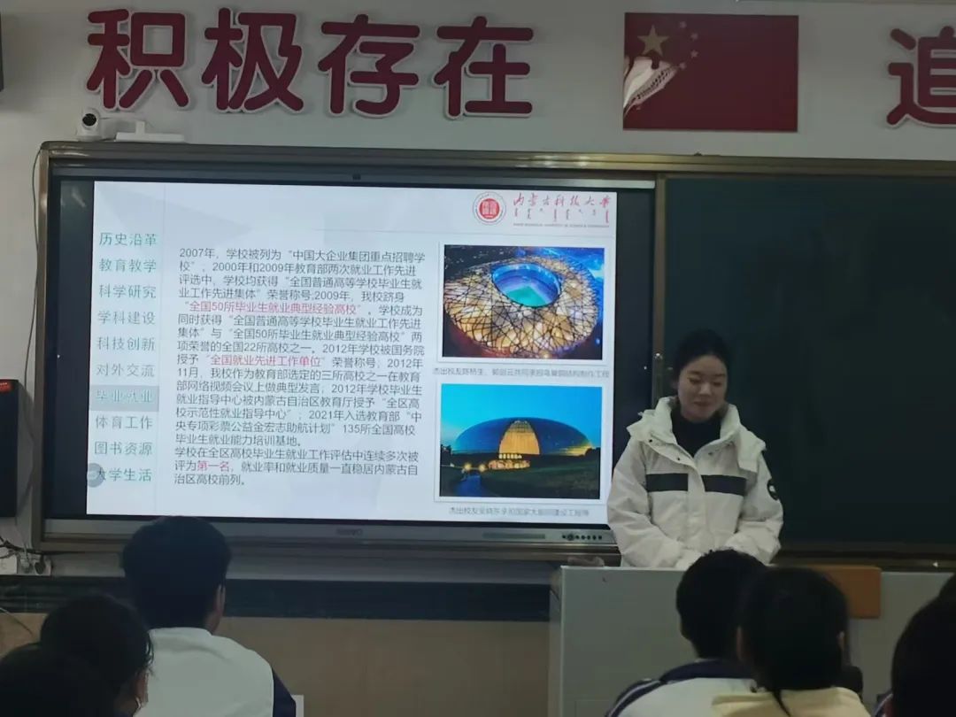 感悟:本次活动,我们通过展示精心制作的PPT、短视频等生动还原了内蒙古科技大学多元的课程体系、丰富的社团活动以及浓厚的学术氛围,用轻松活泼的方式缓解学弟学妹的备考压力。丰富多元的校园生活和浓厚的学术氛围,为高中学子们点亮希望之灯,助力他们清晰展望大学生活。
