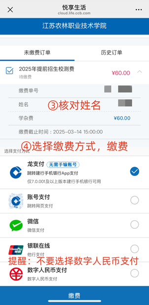 3.点击查询后会显示“2025年提前招生校测费”,核对姓名、选择缴费方式后点击“缴费”。