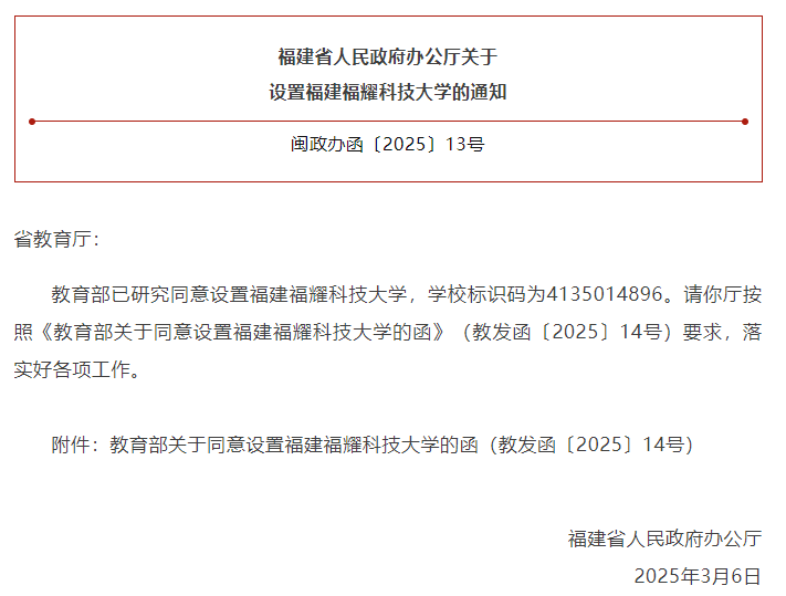 2025年2月21日,教育部正式批复设立福建福耀科技大学。