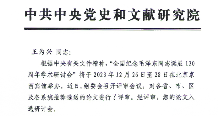 据悉,此次征文按照论文组织、推荐和评选的原则。广泛征集,重点组织,专家评审,择优入选。推荐论文由各设区市和各单位统一组织和报送至省委宣传部,经省委宣传部组织专家对推荐论文进行初评,确定5篇左右论文报送中央党史和文献研究院,再经中央党史和文献研究院筛选和确定。征文通知下达之后,王为兴老师始终坚持以马克思列宁主义、毛泽东思想、邓小平理论、“三个代表”重要思想、科学发展观、习近平新时代中国特色社会主义思想为指导,以毛泽东关于党的思想建设理论的探索为主题,通过读原著、学原文、悟原理的方式,阅读大量有关论文的文献资料,不断追踪党史党建的前言成果。“看似寻常最奇崛,成如容易却艰辛。”在撰写的过程中,王为兴老师投入大量的时间和精力于其中,几经打磨、不舍昼夜、功不唐捐,最终其论文入选“全国纪念毛泽东同志诞辰130周年学术研讨会”。
