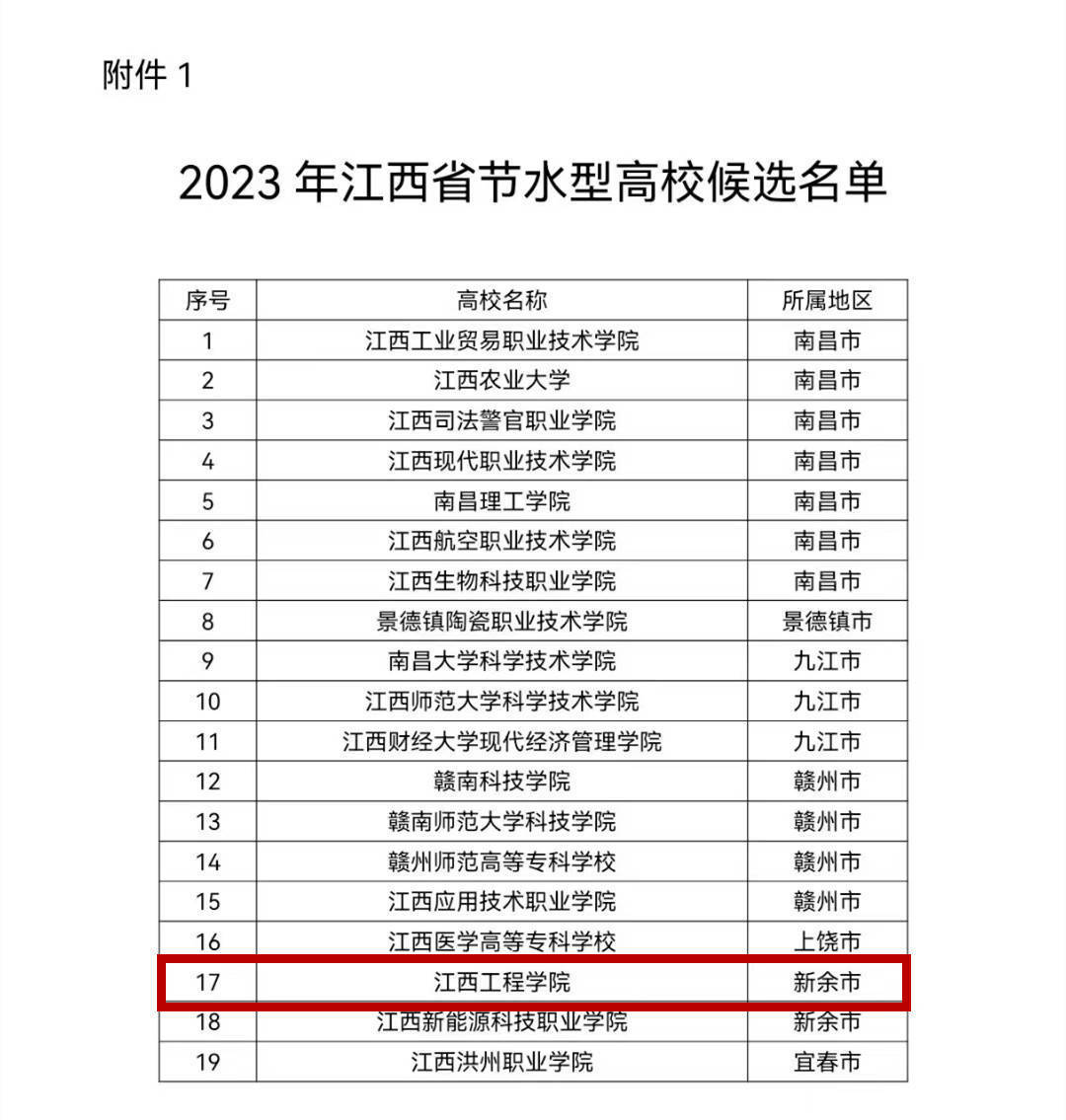 近日,江西省教育厅公布2023年江西这些高校入围省级候选名单并予以公示,根据《江西省节水型高校建设工作方案》(赣水综字〔2019〕9号)部署,2023年,经过省水利厅、省教育厅和省管局评估验收,共有19所高校入围省级节水型高校候选名单,2所高校入围省级节水型高校水效领跑者候选名单。其中,江西工程学院入围省级节水型高校候选名单。