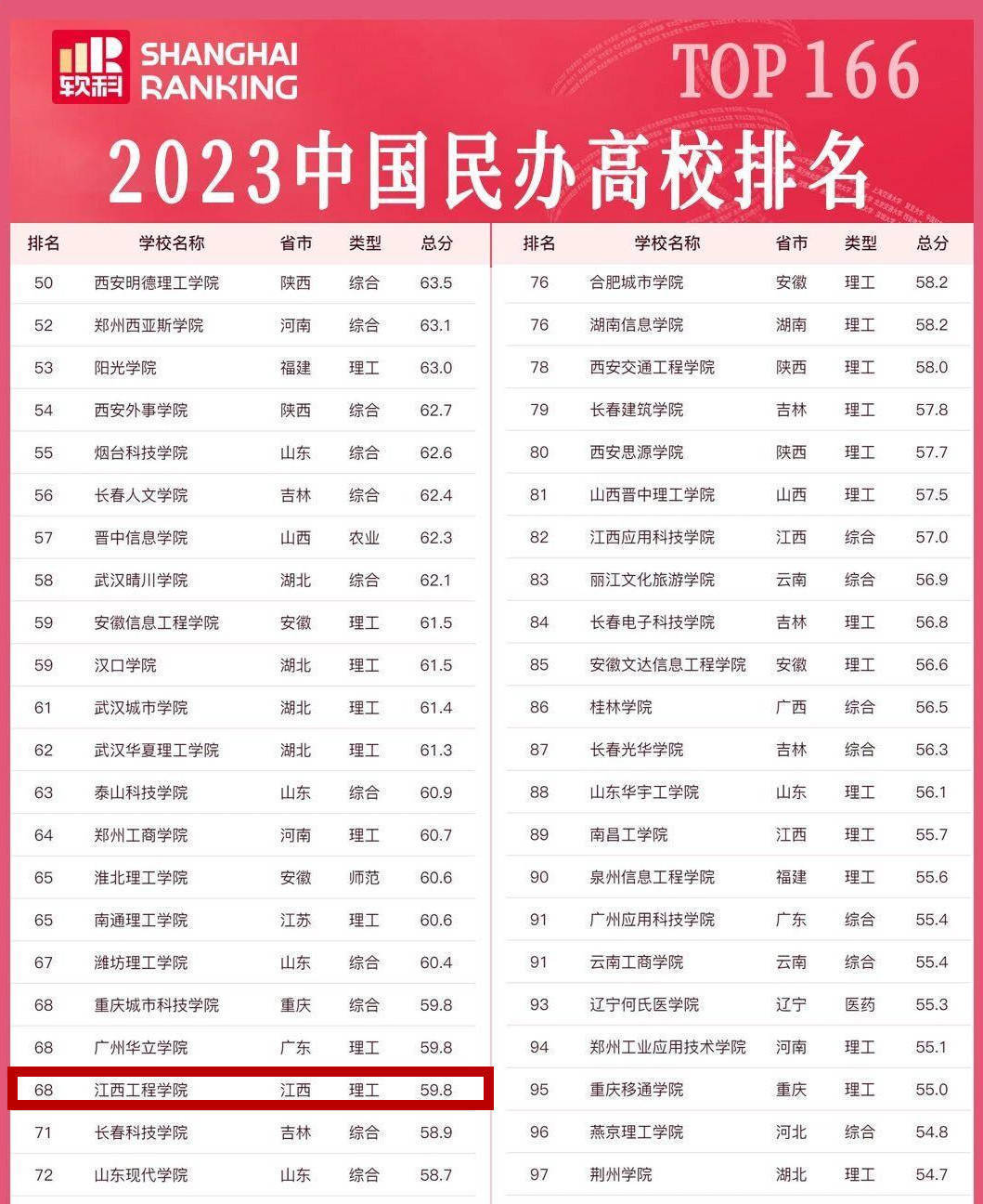 2023年2月15日,《中国民办院校排行榜》公布,共有166所民办院校上榜。这些院校涵盖了综合类、理工类、师范类、农业类、民族类、体育类、医药类等多个类别,显示出中国民办高等教育的多样化和多元化发展趋势。其中,江西工程学院排名第68位(理工类),江西应用科技学院排名第82位(综合类),南昌工学院排名第89位(理工类)。