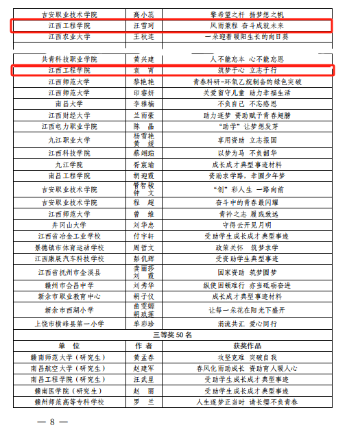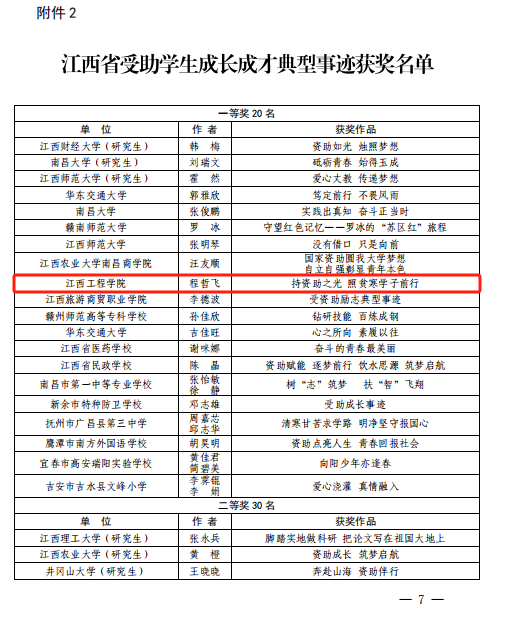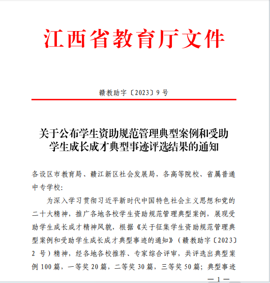 近日,江西省教育厅学生资助管理中心公布了江西省2023年学生资助规范管理典型案例和受助学生成长成才典型事迹评选结果,我校选送的参赛作品荣获江西省学生资助规范管理典型案例一等奖1名、江西省受助学生成长成才典型事迹一等奖1名、二等奖2名、三等奖5名共9篇的好成绩。