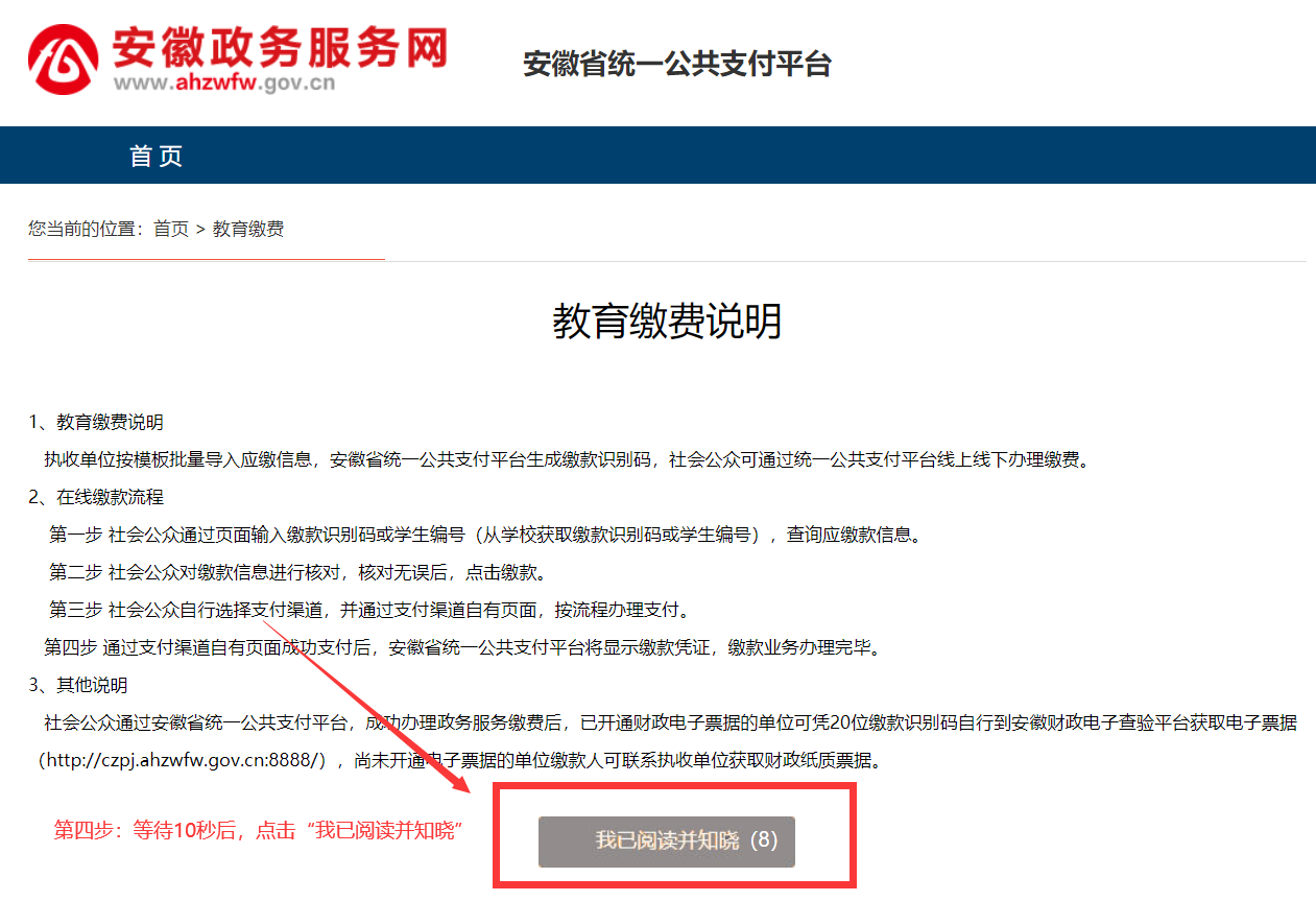 第四步:阅读教育缴费说明,10秒后点击“我已阅读并知晓”。