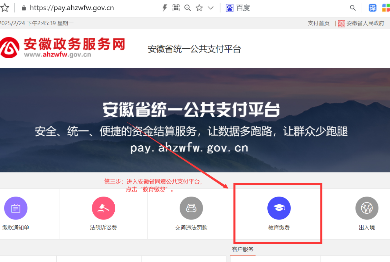 第三步:用手机或者电脑,百度搜索“安徽省统一公共支付平台”官网,或直接输入网址http://pay.ahzwfw.gov.cn/,点击“教育缴费”。