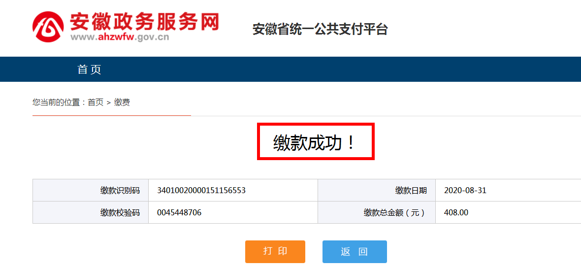 第八步:缴费后该页面出现“缴款成功”即为已经缴费。缴费成功后系统自动生成电子票据,如需电子票据可按后附流程自行查询并打印,学校不再出具纸质票据。