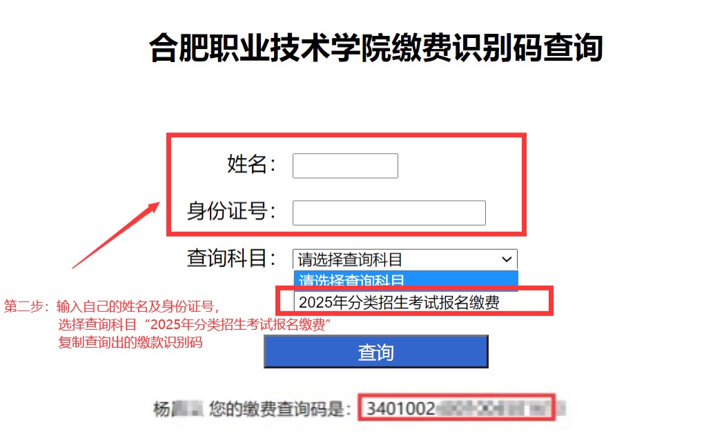 第二步:输入身份证号和姓名,选择相应的查询科目,查询到自己的“缴款识别码”并复制。