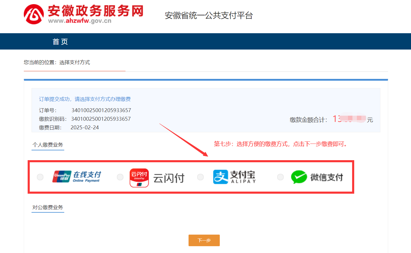 第七步:进入缴费界面,选择个人缴费业务中自己方便的缴费方式缴费即可。