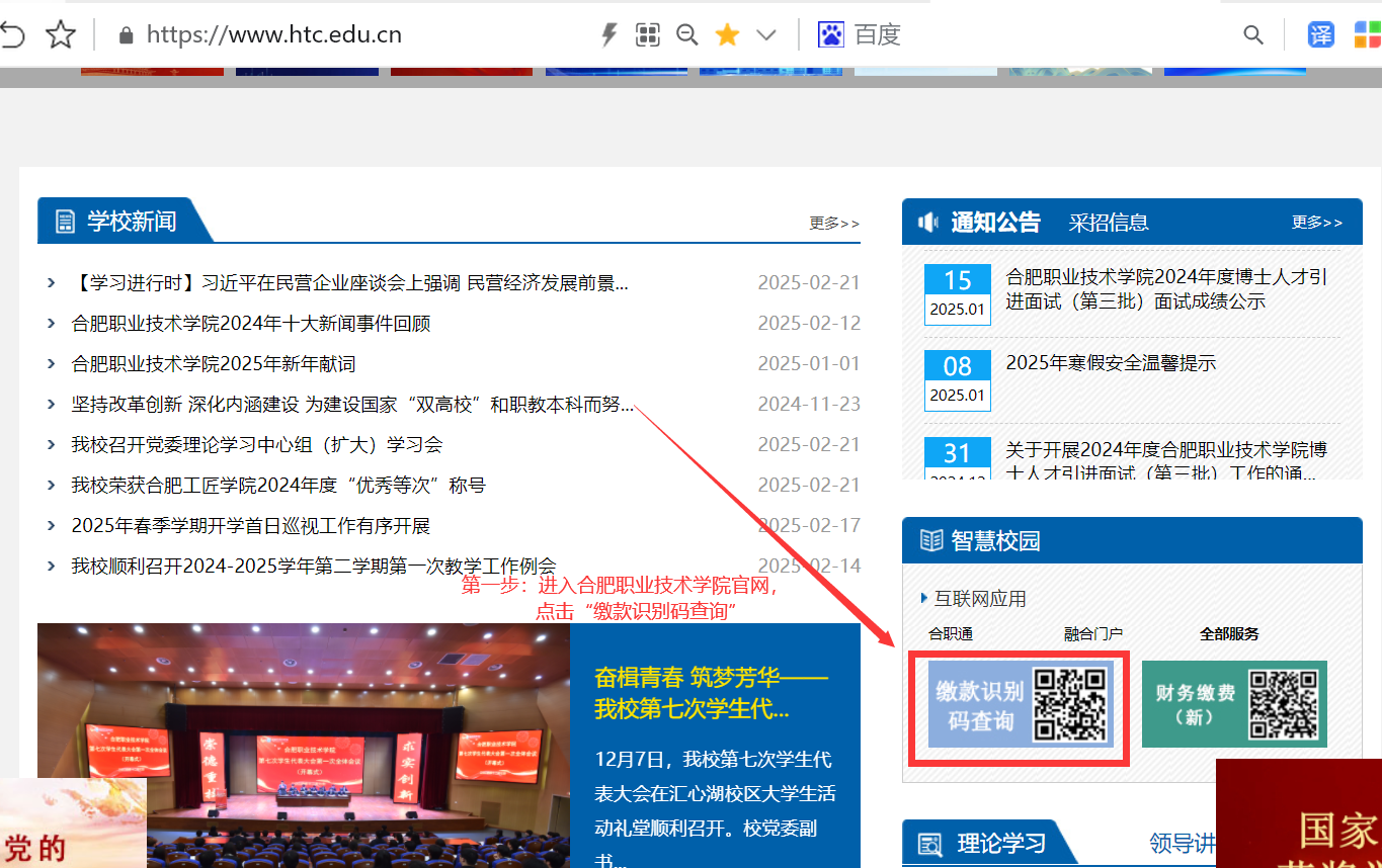第一步:查询“缴款识别码”,用手机或者电脑,百度搜索“合肥职业技术学院”官网,或者输入网址https://www.htc.edu.cn/,进入学院网站首页,点击智慧校园校园栏目里的“缴款识别码查询”。