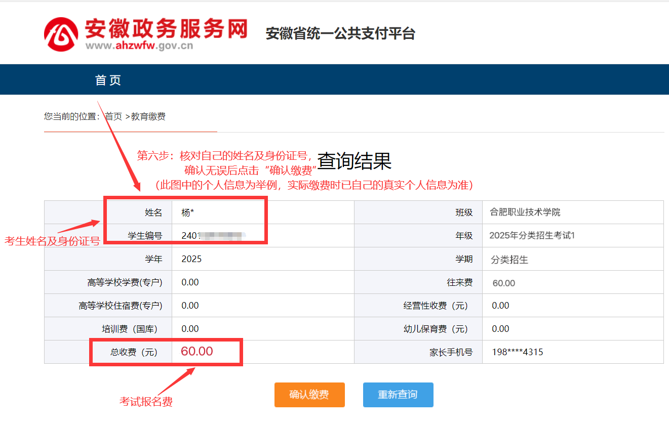第六步:查询结果页核对自己的个人信息,核对无误,点击确认缴费。