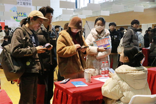 招聘会现场人头攒动,前来求职咨询的同学积极与用人单位工作人员交流咨询。郭文耀 摄