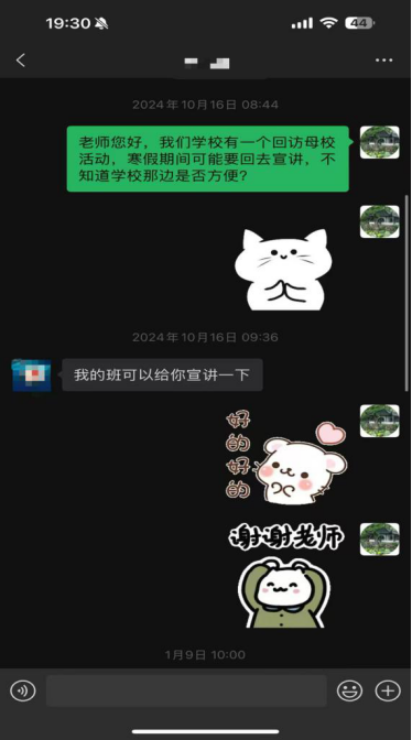 10月16日,我与高中班主任联系,确定回访时间、场地,并了解母校宣传规定。