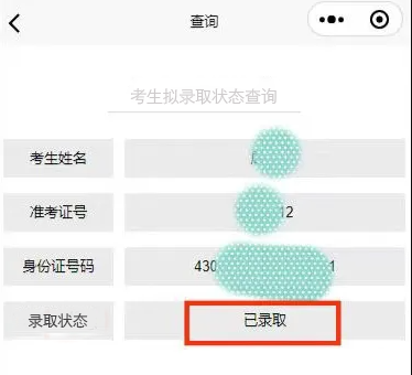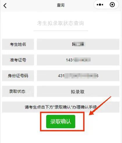 【步骤5】确认后,再次进入学校微信公众号,进行拟录取查询(重复操作步骤1、步骤2),查询状态如下图所示,即录取确认完成。