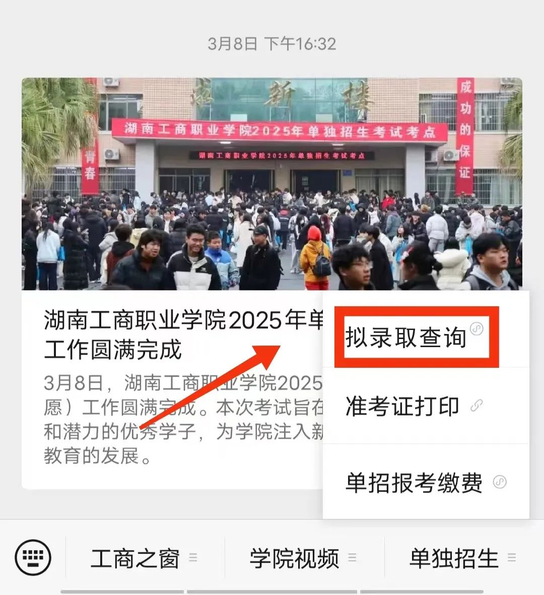 根据我校2025年单独招生章程规定,(一志愿)拟录取工作已全部完成,考生可登录我校微信公众号系统查询。凡被我校拟录取的考生请于2025年3月17日前完成录取确认,逾期未完成确认者,视为主动放弃录取资格。最终录取结果以湖南省教育考试院的公布为准。