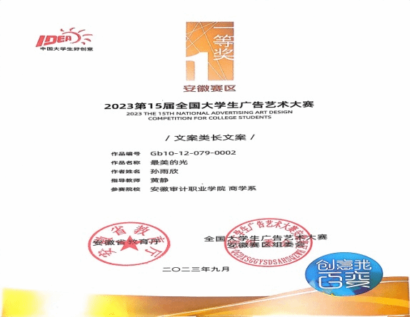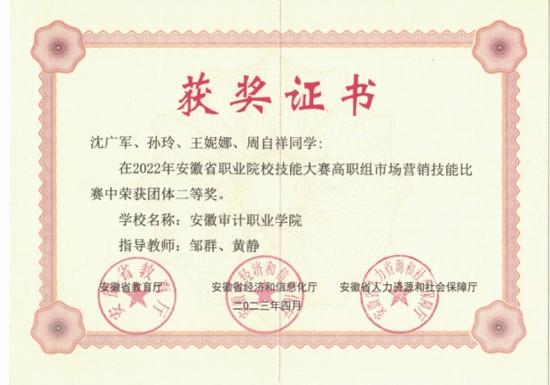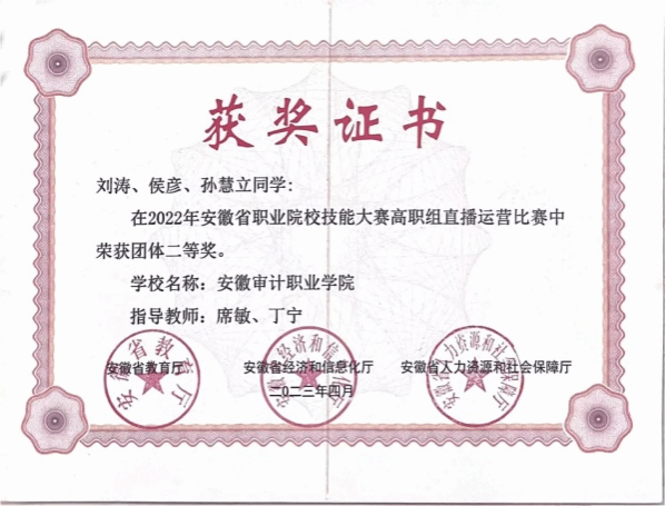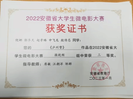 2022年学生参与安徽省职业院校技能大赛市场营销赛项,获得省赛二等奖,乡村振兴赛项获得省赛三等奖,直播运营赛项获得省赛二等奖,安徽省大学生广告艺术设计大赛一等奖,安徽省微电影大赛三等奖。