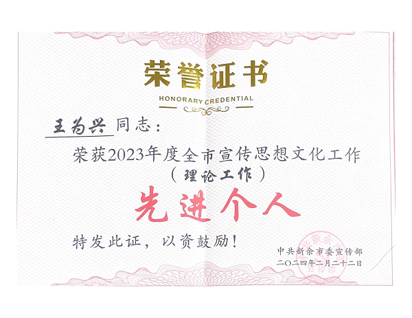 近日,中共新余市委宣传部印发《关于表扬2023年度全市宣传思想文化工作先进单位和先进个人的通报》,我校王为兴老师荣获2023年度全市宣传思想文化工作(理论工作)先进个人。