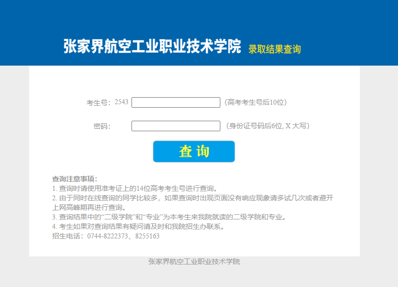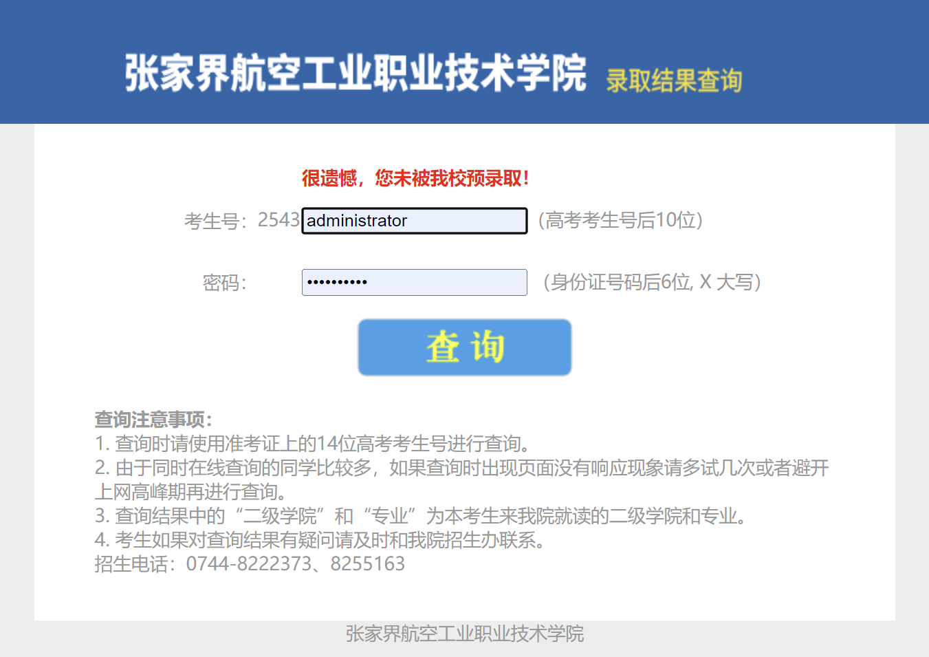 3. 在单招预录取查询与确认页面输入用户名,用户名为考生号后10位,密码为身份证后6位,X为大写,点击 查询 ;