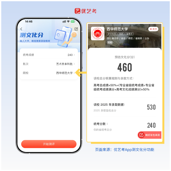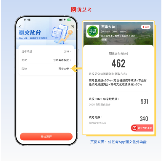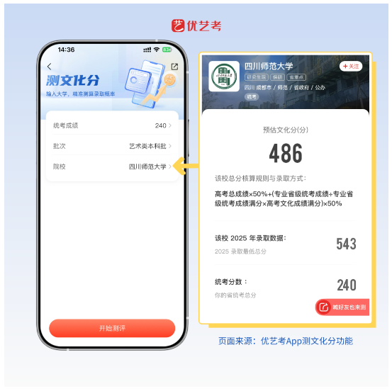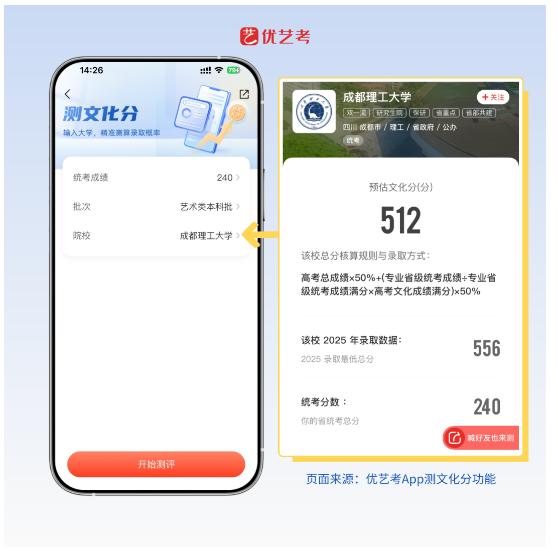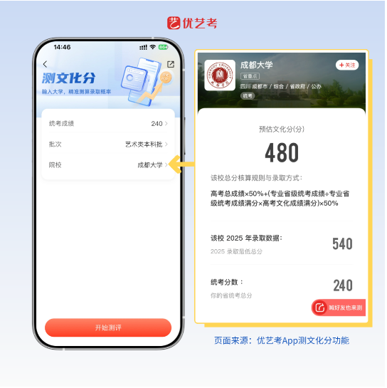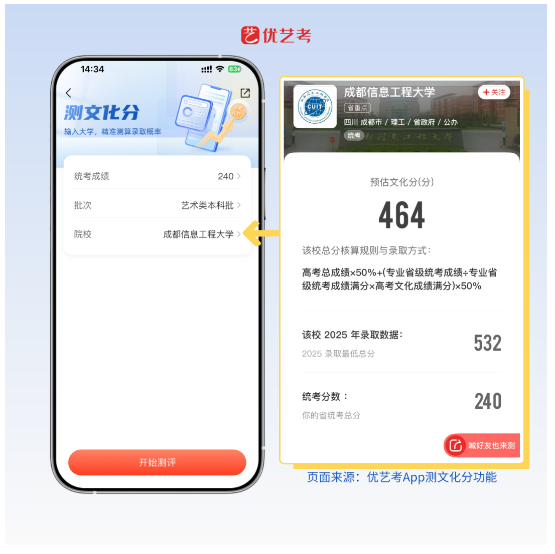 如果考生想要了解更多院校所需文化分,欢迎大家进入优艺考App或小程序内的测文化分功能查看。