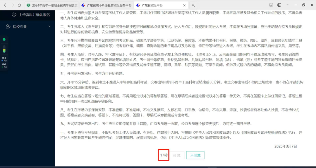 (一)阅读《广东省2025年高职院校五年一贯制单独招生考试考生守则》,等待读秒结束点击“同意”按钮