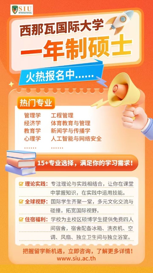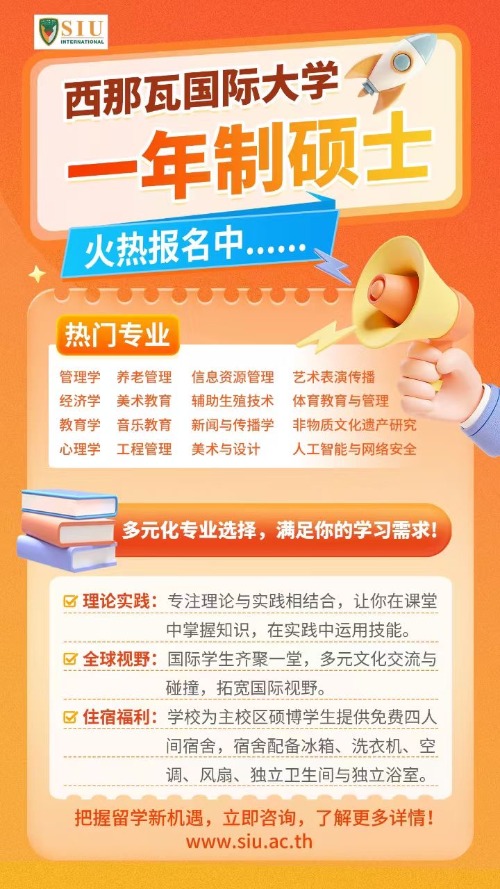 通知:【西那瓦国际大学新增#一年制硕士 】?入学时间:2025年9月📑学习时长:1年全程出境💝就读福利:免费4人间直至毕业,宿舍自带空调、卫生间、淋浴室、洗衣机等设备咨询热线📞:0854-7012345 0854-7025555