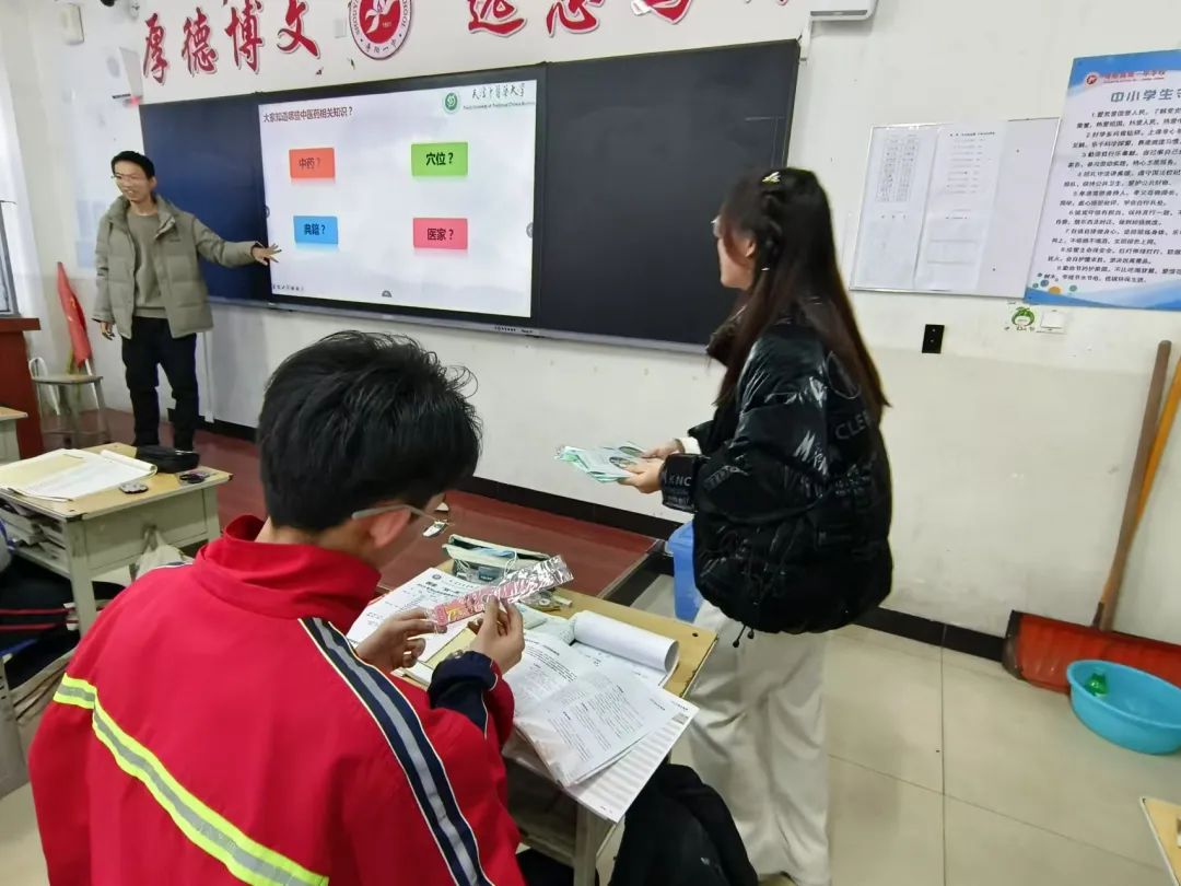 “同学们知道有哪些中医古籍或者医家吗?”“猜猜这包香囊里可能会装什么药材?”活动伊始,回访团队以趣味问答开启交流,将中医药知识融入轻松互动之中。同学们踊跃举手回答,现场同学收到了特制的中药香囊,行李牌,明信片等学校相关文创小礼物,通过一系列互动,在传播中医药文化的同时,又拉近了与同学们的距离。