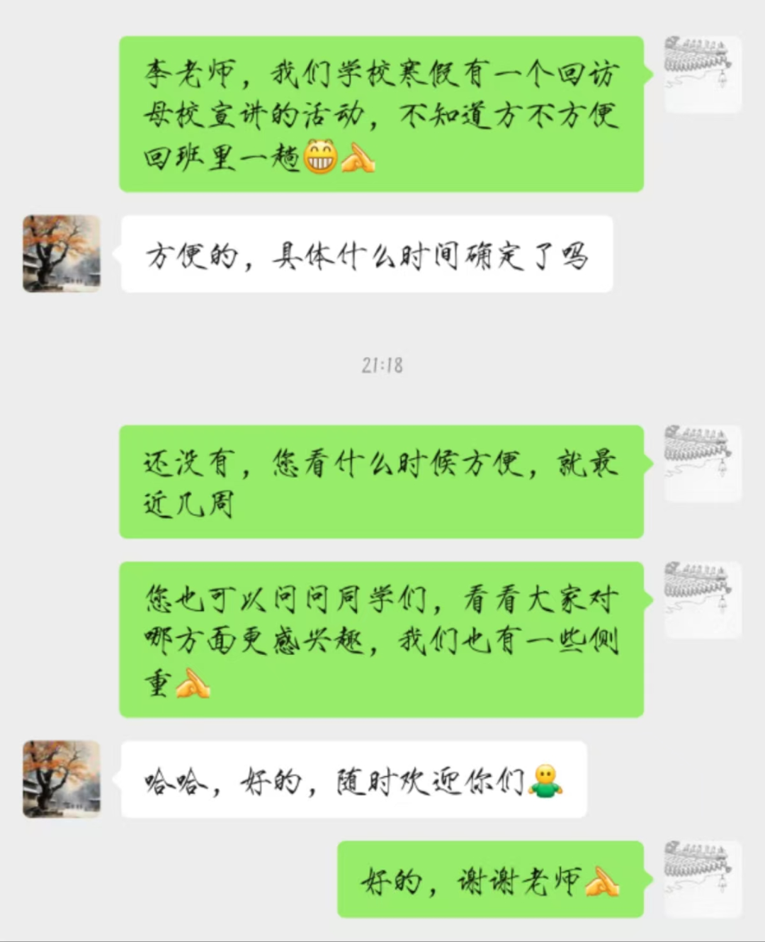 回到家乡后,我们团队及时与学校老师取得联系,积极配合学校安排,参加了校方组织的培训,与负责对接的老师进行了沟通,提前了解同学们感兴趣的内容和问题,对宣讲内容进行补充调整,同时确认了宣讲形式,地点与时间,为回访活动的成功进行,打下了坚实基础。