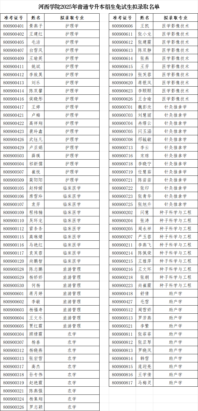 河西学院2025年专升本免试生招生录取工作已完成,现将拟录取名单予以公示,公示期为2025年3月16日-3月18日。各位考生若对录取结果有异议,请在公示期内联系河西学院招生办,过期不再受理相关异议。联系电话:0936-8283598。