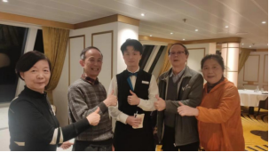 2020级邮轮学子阮启胜曾就职于武汉扬子江游船有限公司“总统6号”,现就职于我国首艘国产大型邮轮“爱达•魔都号”邮轮,职位是餐厅服务生(左三),薪资1350美金。
