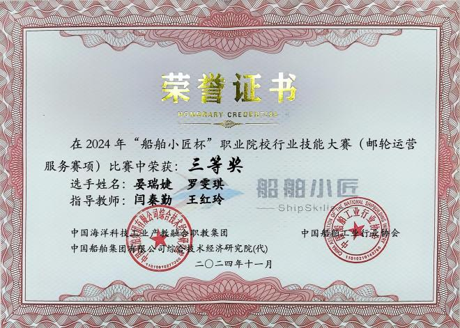 2024年“船舶小匠杯”全国职业院校行业技能大赛(邮轮运营服务赛项)三等奖(2023级晏瑞婕、罗雯琪指导老师:闫秦勤、王红玲)