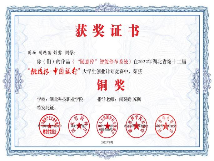 2022年湖北省第十二届“挑战杯•中国银行”大学生创业计划竞赛铜奖(2020级周欢团队 指导教师:闫秦勤、苏枫)