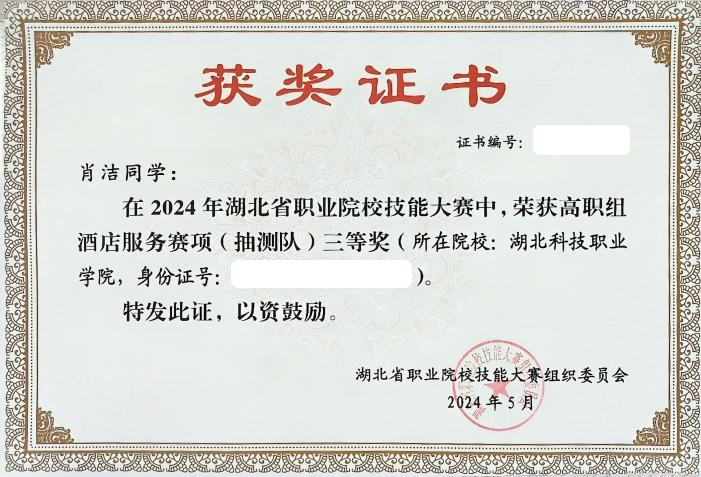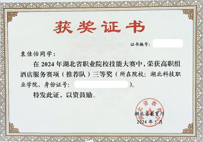 2024年湖北省职业院校技能大赛酒店服务赛项学生推荐组(团体赛)三等奖和抽测组(团体赛)三等奖。(2022级袁佳怡、肖洁指导老师:闫秦勤、杨国丽)